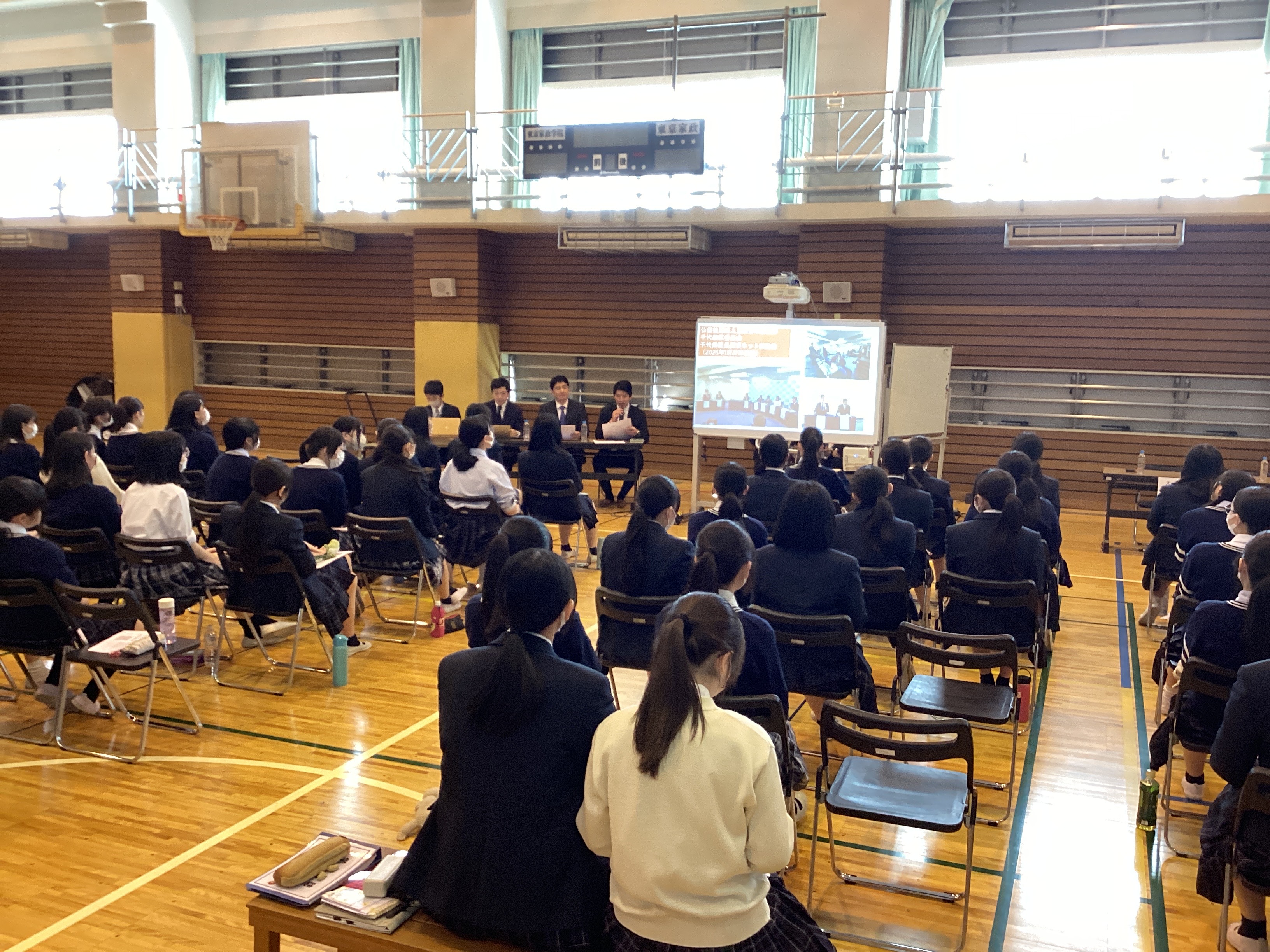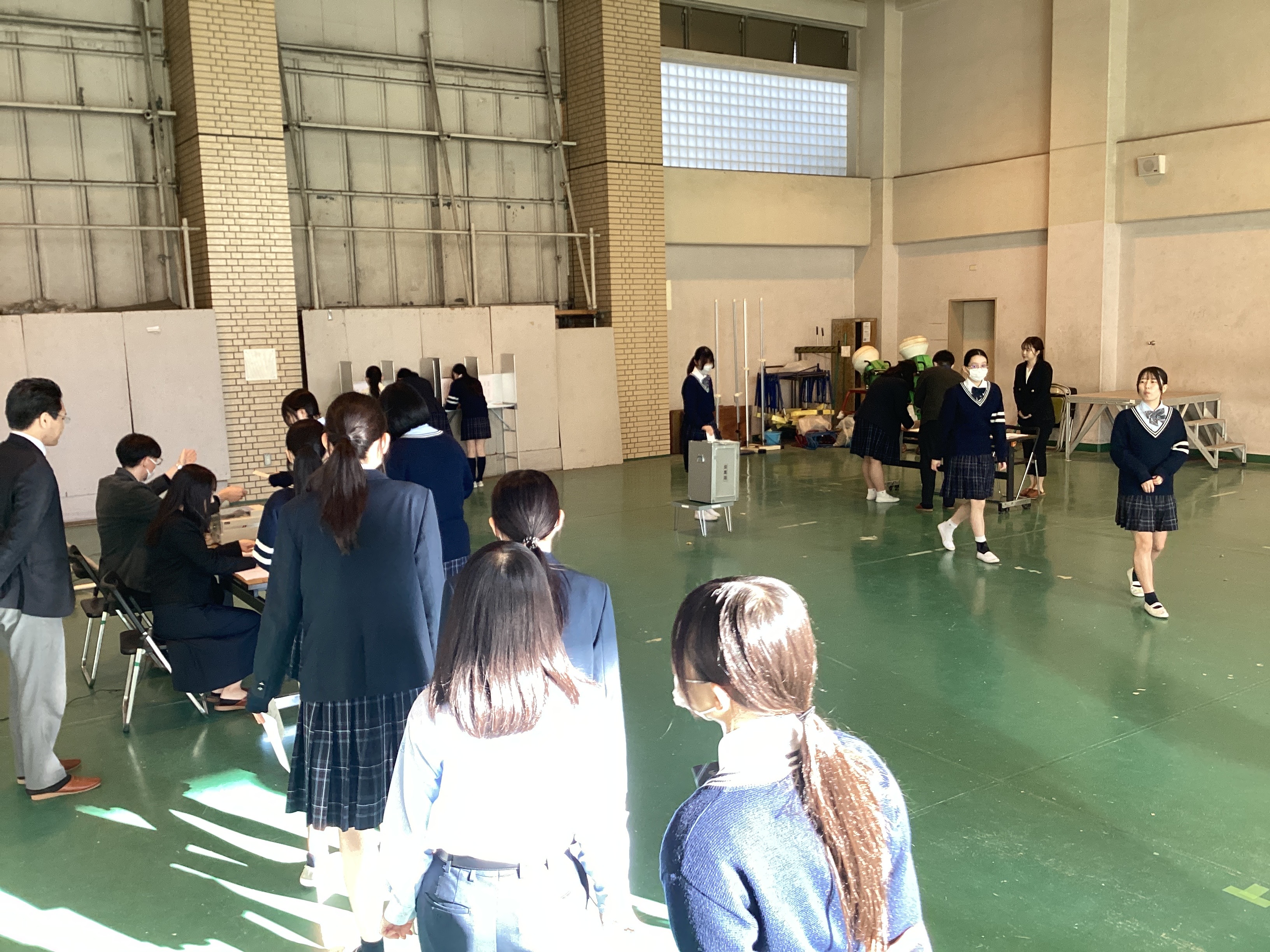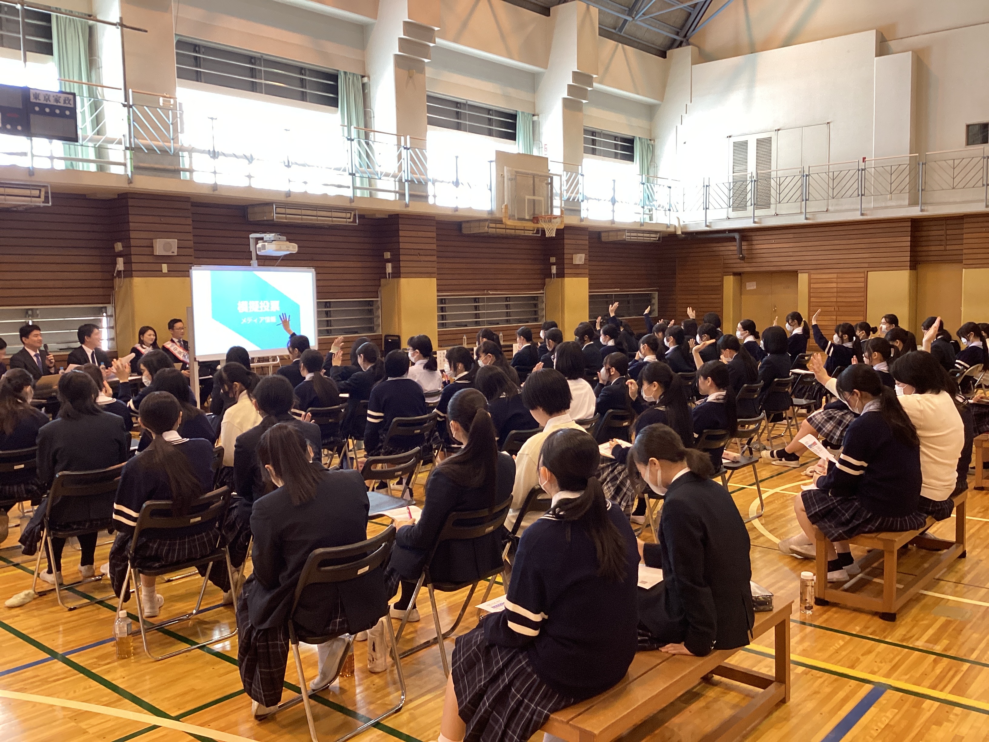 架空の都市の区長選挙の立候補者を3名立てて、実際に演説や討論会が開かれました。また立候補者に生徒が質問をして、グループで意見を交わしてから、その上で投票を行いました。その他、選挙に関するクイズや税金についてのお話も伺いました。18歳からの選挙に向けて有意義な学習でした。