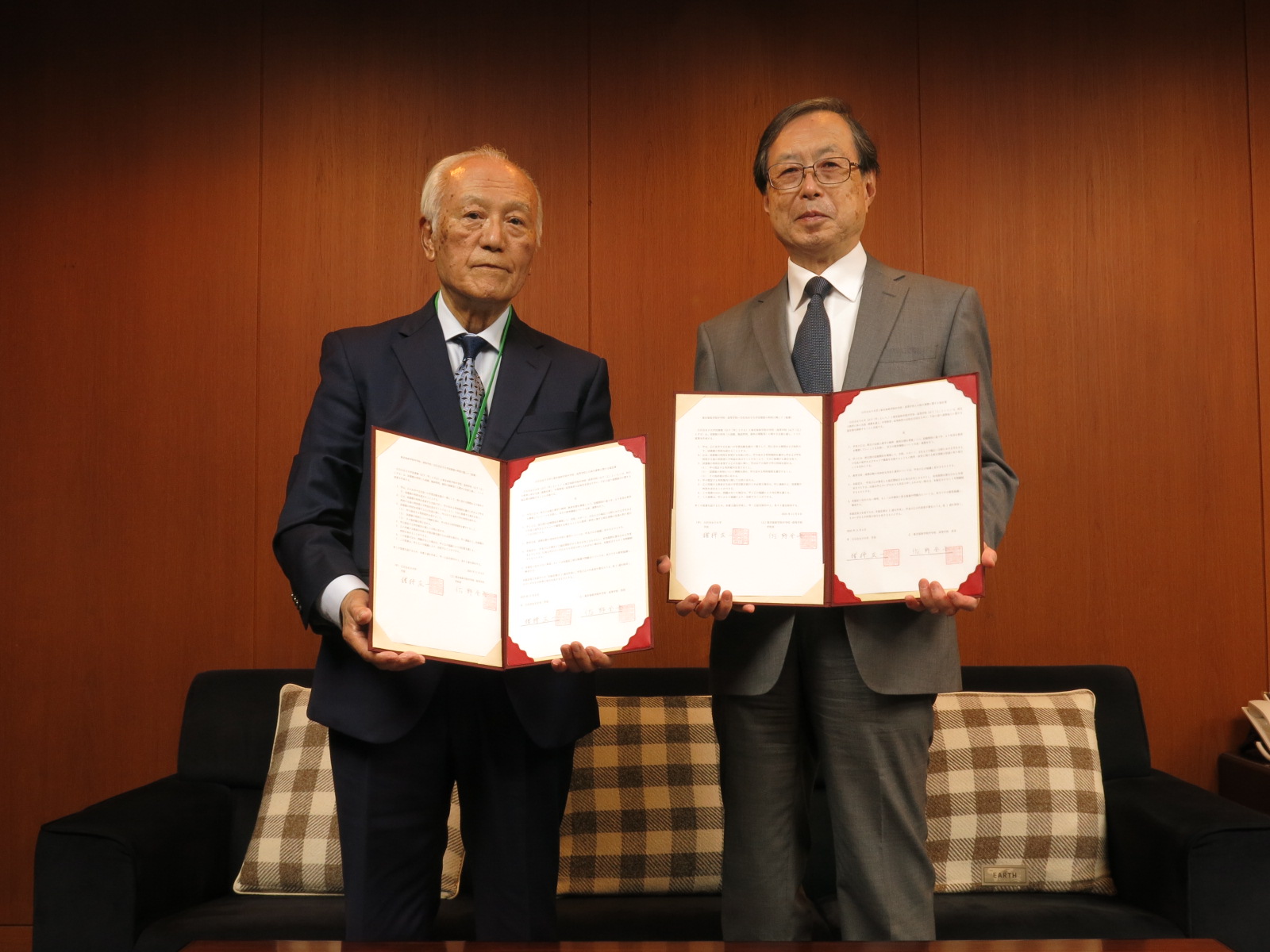 協定書交わす、白百合女子大学 猪狩 友一学長(右)、本校校長 佐野 金吾(左)