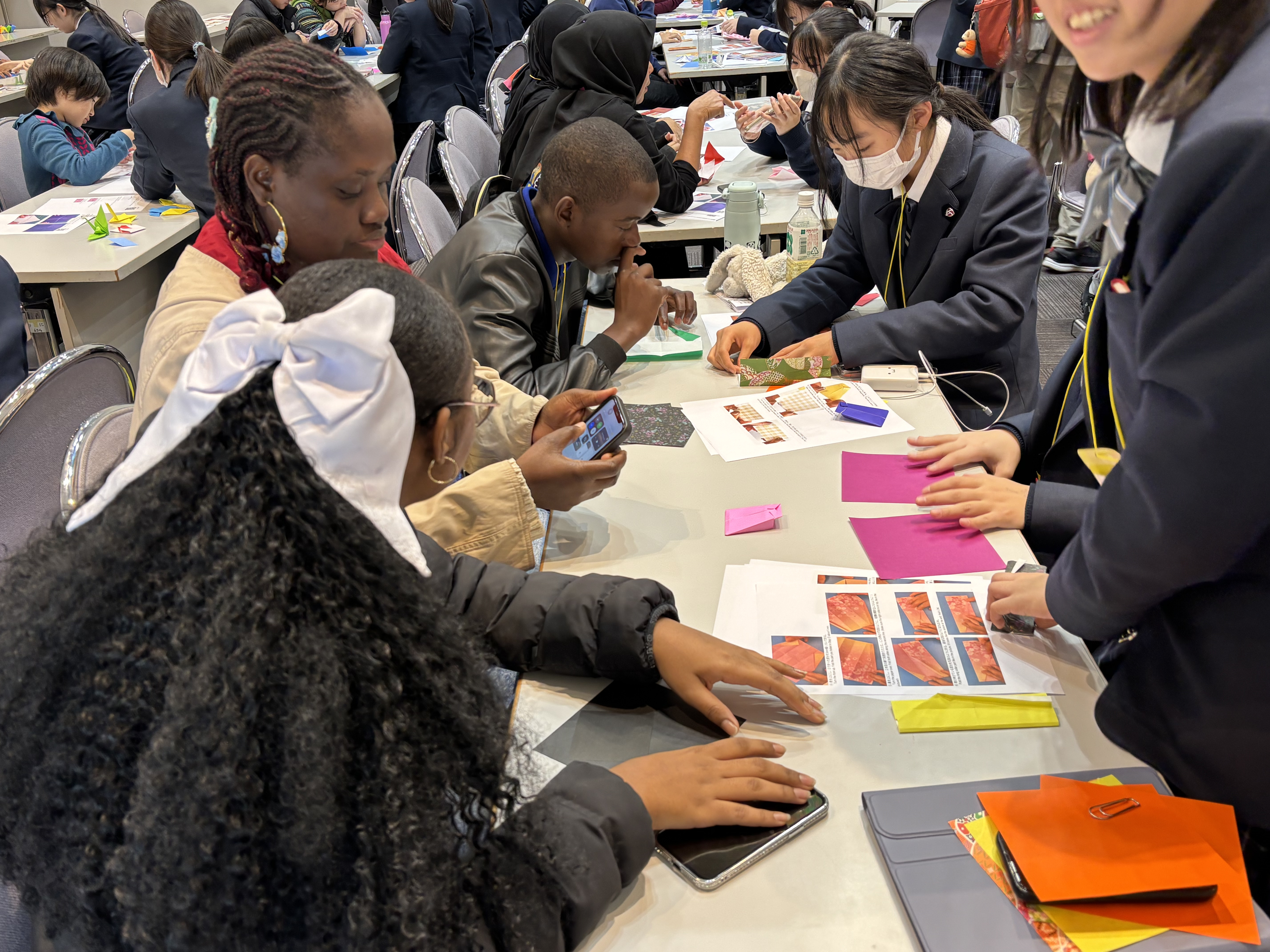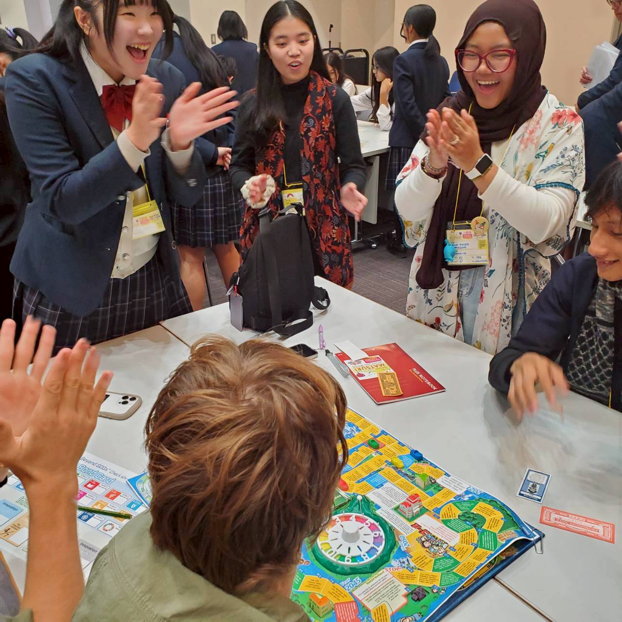 また、両日ともに来日した生徒、保護者を対象にワークショップを開催しました。本校からは日本の伝統である折り紙、茶道、現在SDGsの学びを普及するために本校で導入しているBeyond SDGs 人生ゲーム(金沢工業大学、タカラトミー社開発)の各ワークショップを企画・運営しました。