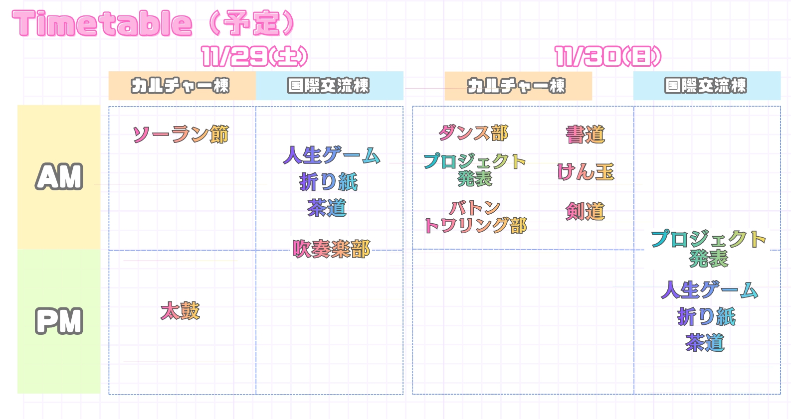 ・30日(日):中学2,3年生プロジェクト発表、ワークショップ、日本文化パフォーマンス、ダンス部、バトントワリング部