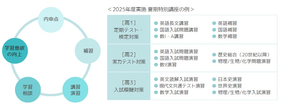 長期休暇中に行われる特別講座です。1講座100分で実施し、目的に応じて自由に参加することができます。