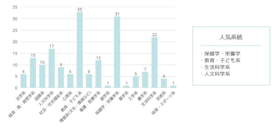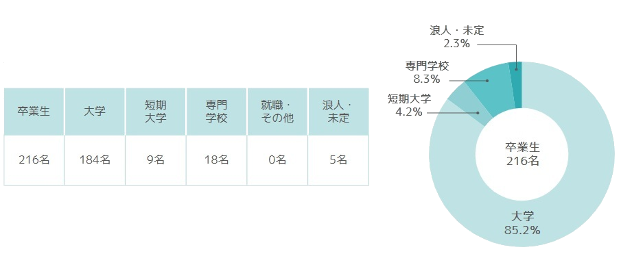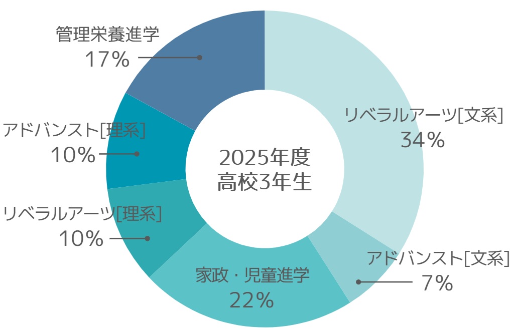2025年度高校3年生は、リベラルアーツコース・アドバンストコースの文系が約41%。指定校推薦も視野に入れながらがんばっています。近年人気を集めている理系(リベラルアーツコース理系・アドバンストコース理系・管理栄養進学コース)は学年で約37%を占めており、少人数制の授業展開は体験を重視することで一人ひとりの興味・関心を伸ばします。コースを自分で決定することで、将来への夢と自信を深めていきます。
