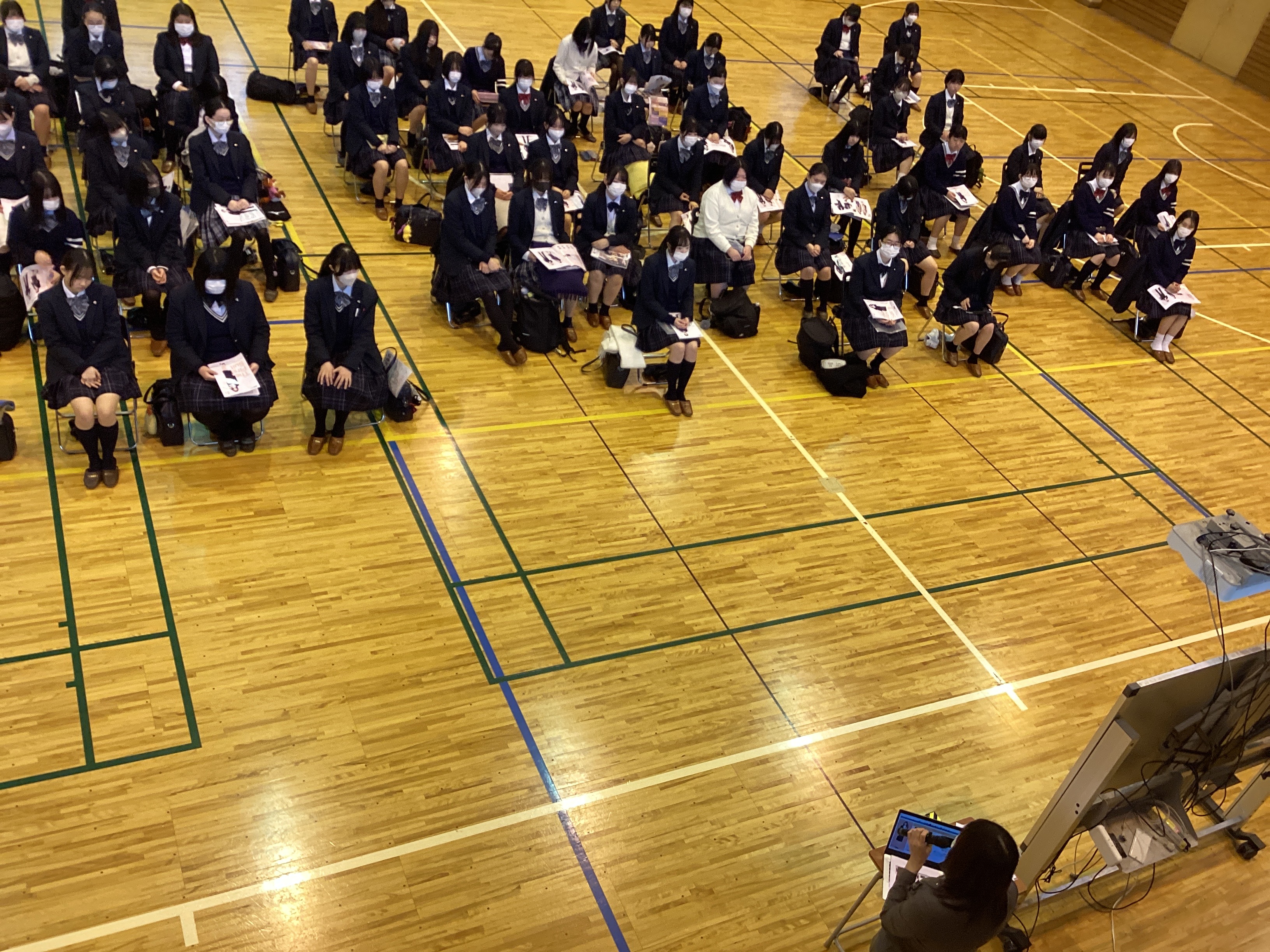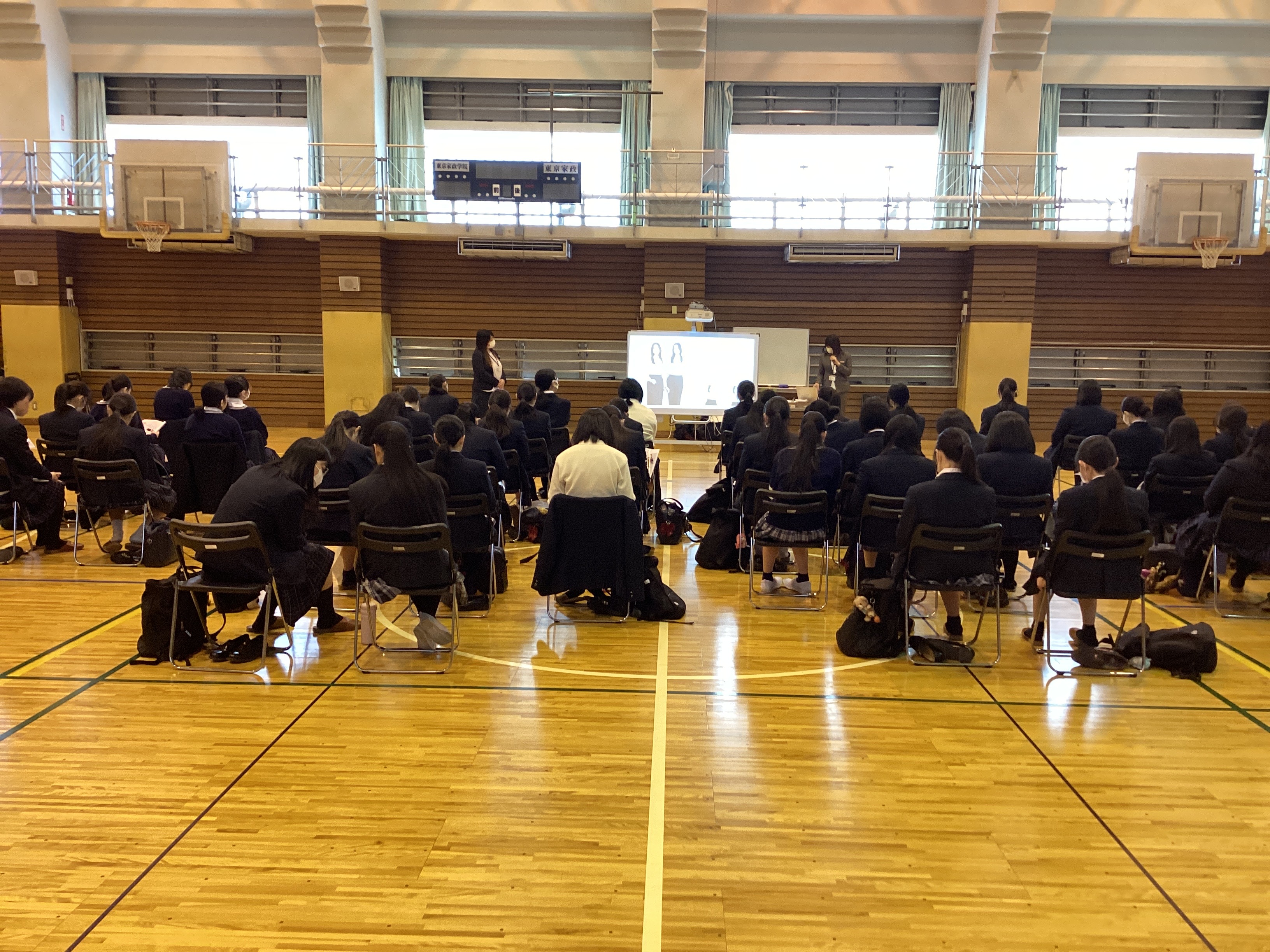 入学式で必要なスタンダードのスーツや、冠婚葬祭でのフォーマルな装いを意識したスーツの着こなし方セミナーを紳士服のコナカさんの方にお越し頂き、お話を聴かせて頂きました。パンツスタイルとスカートスタイルそれぞれのポイントを紹介すると、生徒たちは姿勢や丈感の違いに気づき、自分の服装を熱心に確認していました。ネクタイやリボン、靴との組み合わせにも関心が高く、場にふさわしい服装の大切さを学びながら、進学や将来を具体的に思い描く様子が見られました。