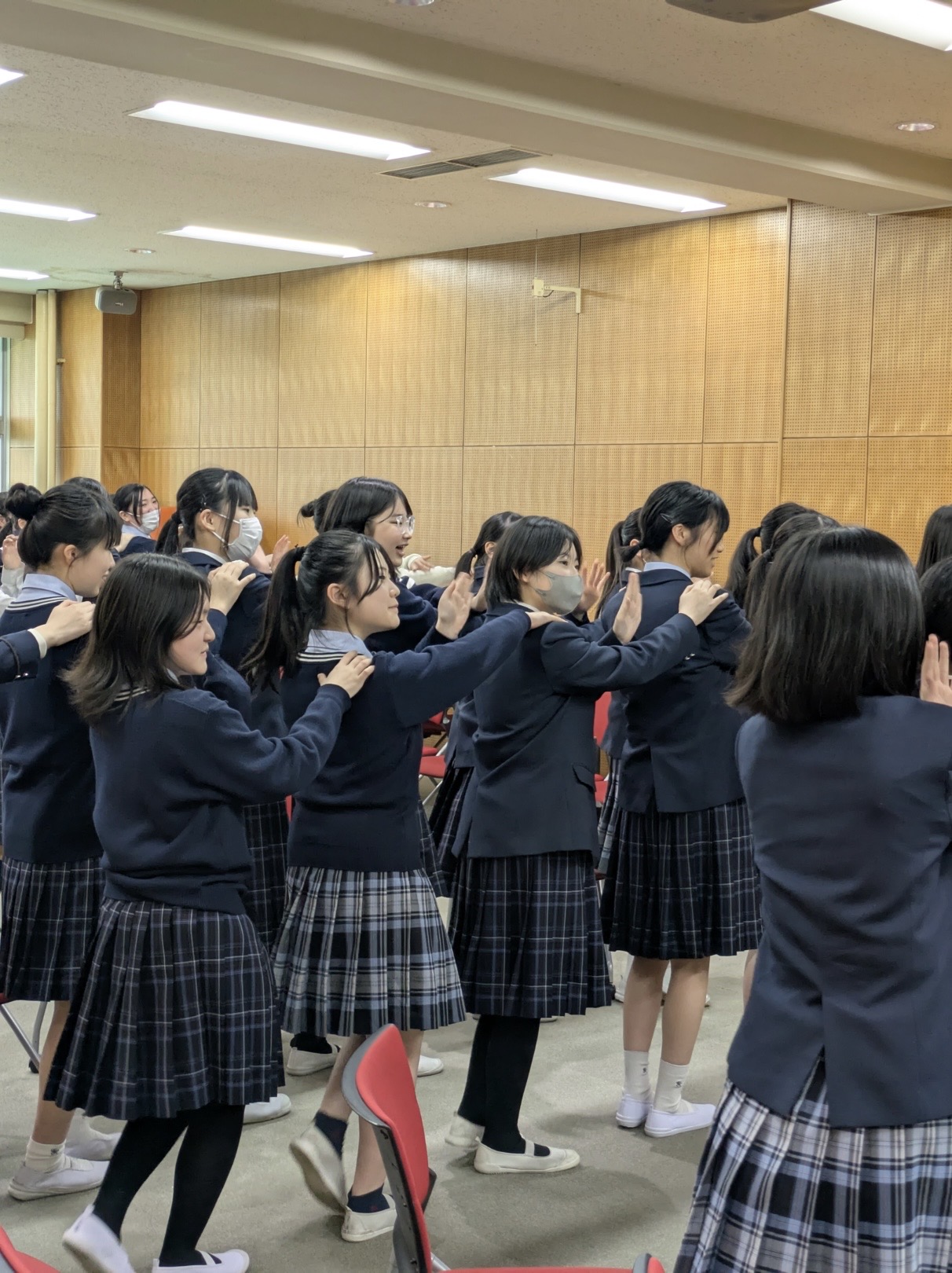 そのあとは、修学旅行の説明、今年度実施するプロジェクトの説明と続きました。どれも自分だけでなく相手への配慮が大切な場面が多々あります。最後に、昨年度のポスタビでもお世話になった、エスコートダンス協会の野口様をお招きして講座をしていただきました!まさに今日の重要ポイントであった、自分も大切にしながら他者への理解も示すことを体感できた、楽しくすばらしい時間でした。