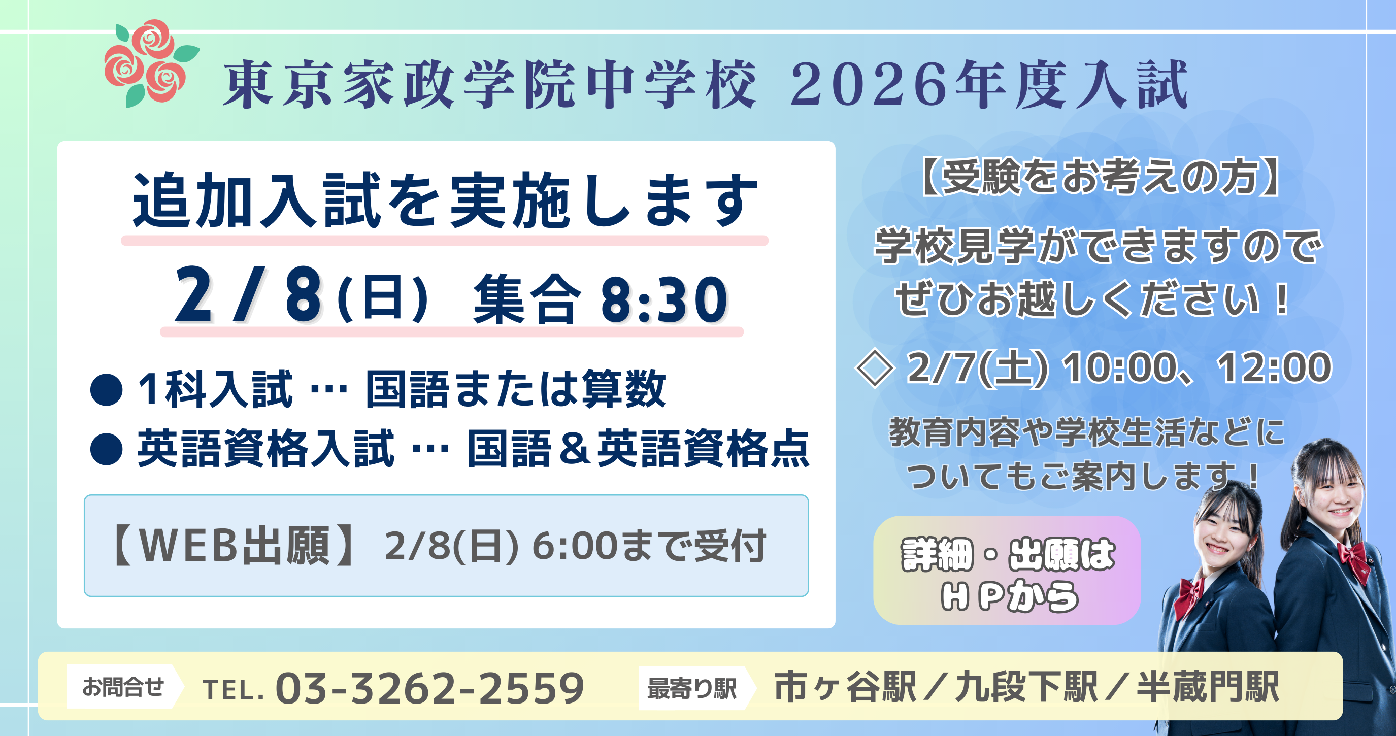 【中学受験生の皆様へ】追加入試(2/8(日))のお知らせ ※1科入試(国語または算数)、英語資格入試(国語&英語資格点)2025.09.08