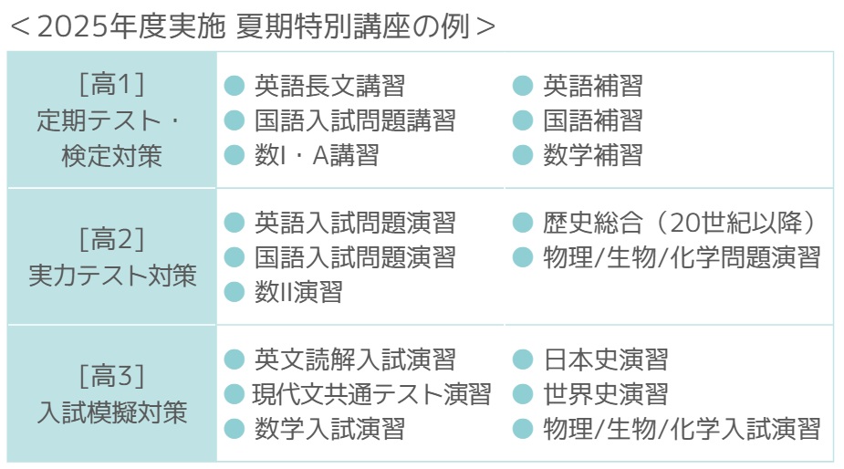 長期休暇中に行われる特別講座です。1講座100分で実施し、目的に応じて自由に参加することができます。