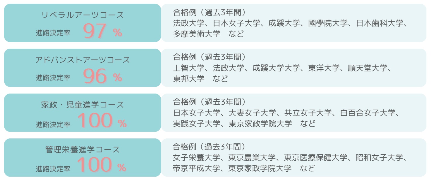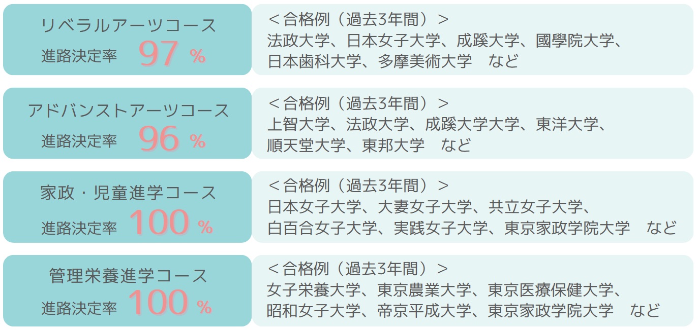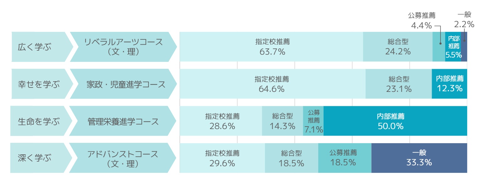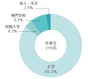 2025年度高校3年生は、リベラルアーツコース・アドバンストコースの文系が約41%。指定校推薦も視野に入れながらがんばっています。近年人気を集めている理系(リベラルアーツコース理系・アドバンストコース理系・管理栄養進学コース)は学年で約37%を占めており、少人数制の授業展開は体験を重視することで一人ひとりの興味・関心を伸ばします。コースを自分で決定することで、将来への夢と自信を深めていきます。