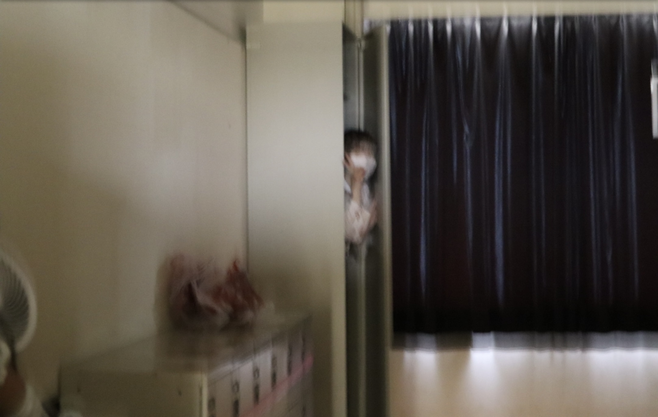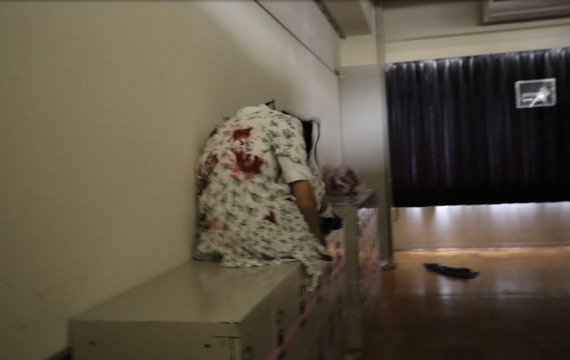 先頭に待ち受けるおばけ①、ロッカーから出てくるおばけ②。(暗くてカメラが認識しない…)