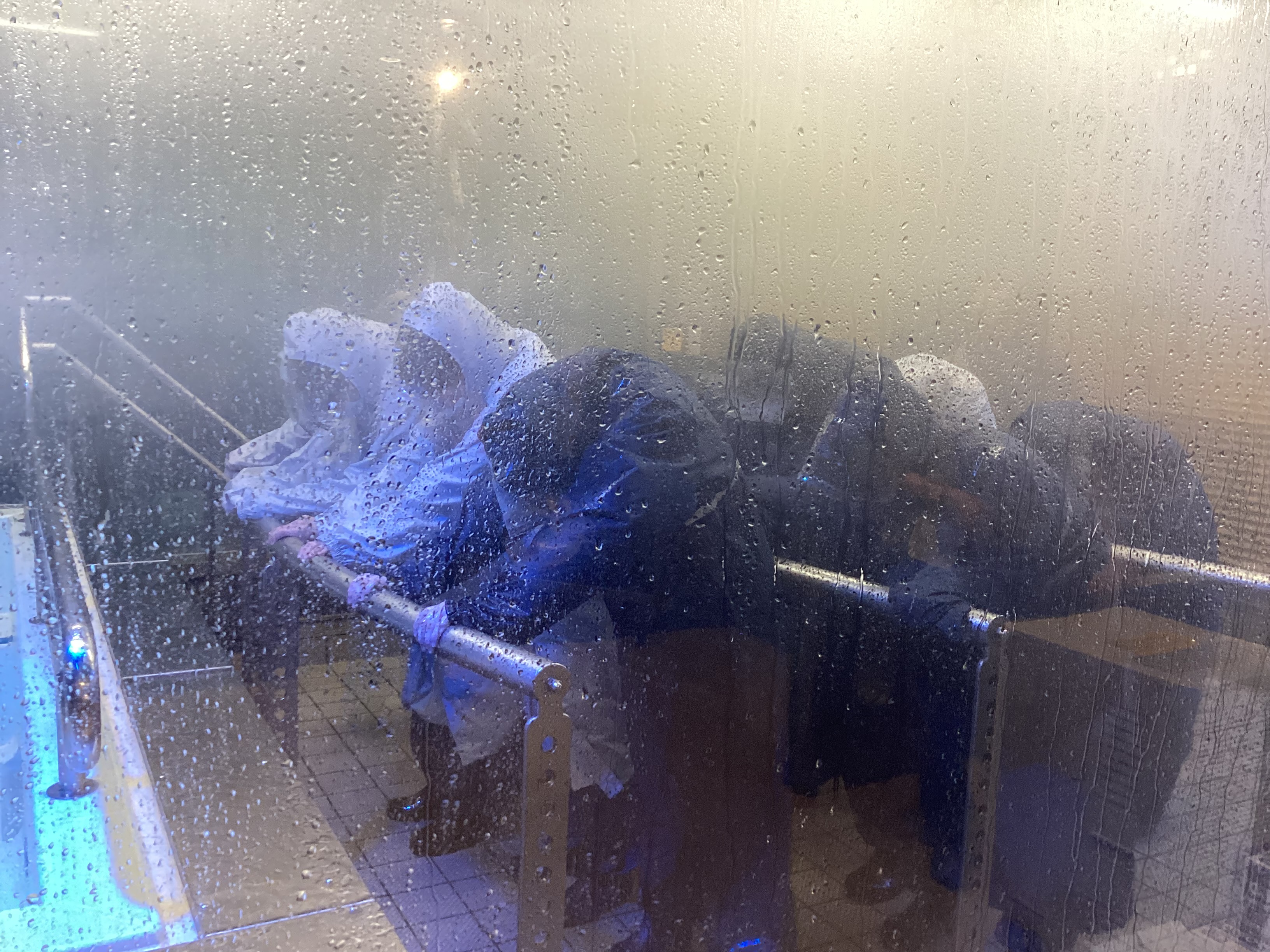 - 暴風の強さが結構あり、真正面で歩くと息ができないなと感じた。また、暴雨は雨が結構強く、背中に当たるだけでも痛いなと感じた。雨の強さが普段の雨よりも何倍も強いと感じた。