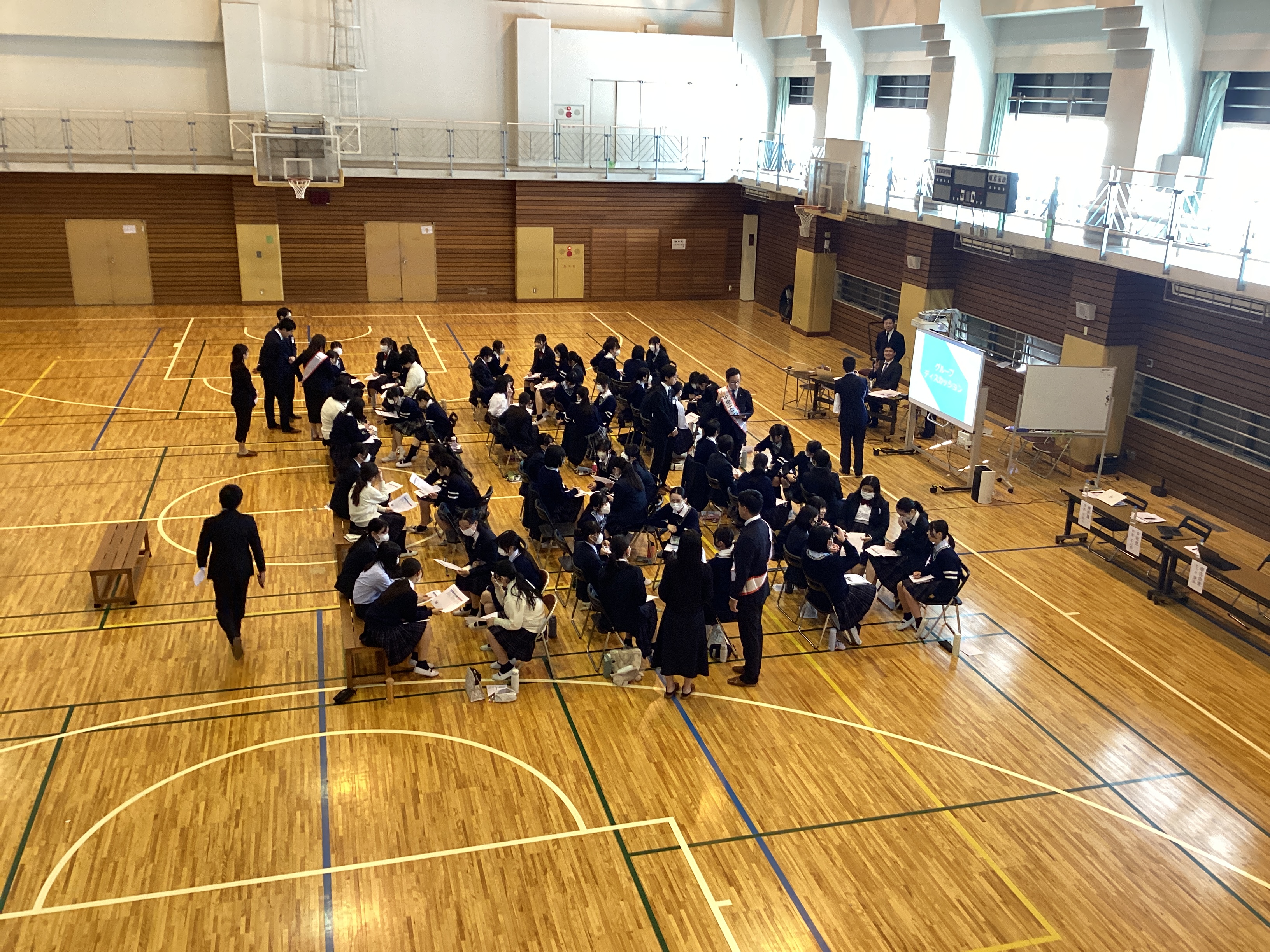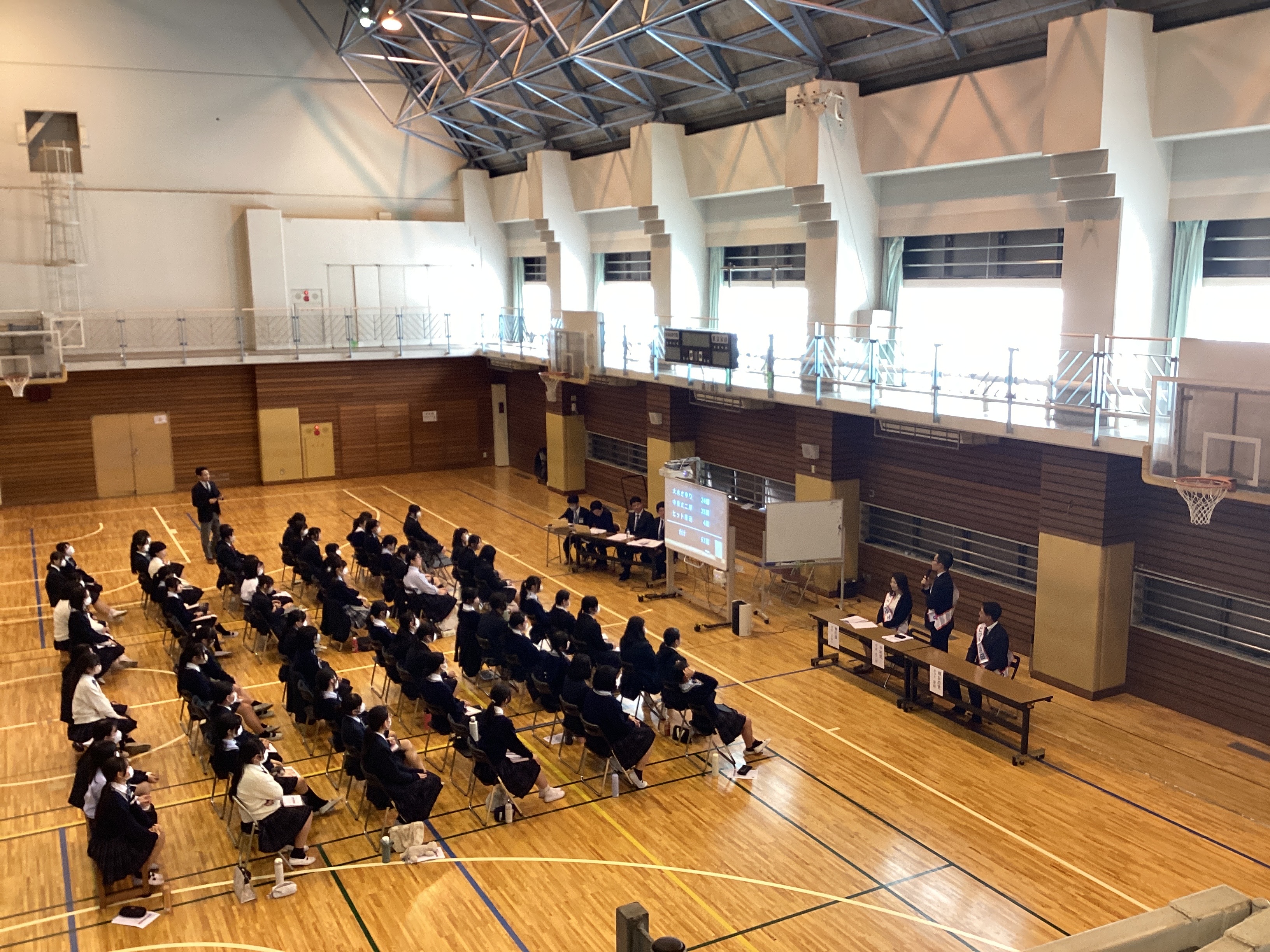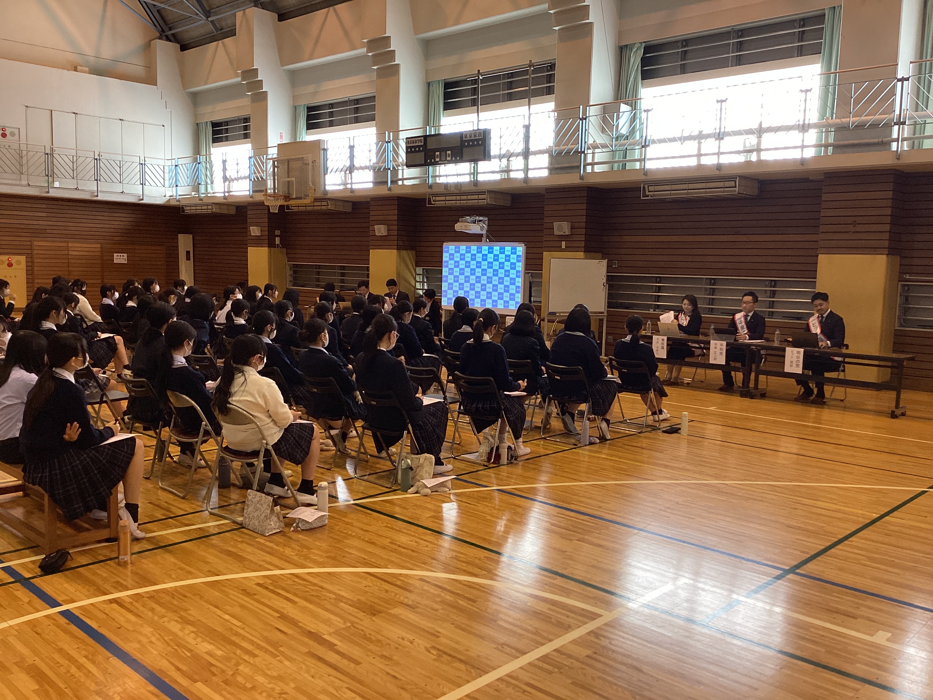 架空の都市の区長選挙の立候補者を3名立てて、実際に演説や討論会が開かれました。また立候補者に生徒が質問をして、グループで意見を交わしてから、その上で投票を行いました。その他、選挙に関するクイズや税金についてのお話も伺いました。18歳からの選挙に向けて有意義な学習でした。