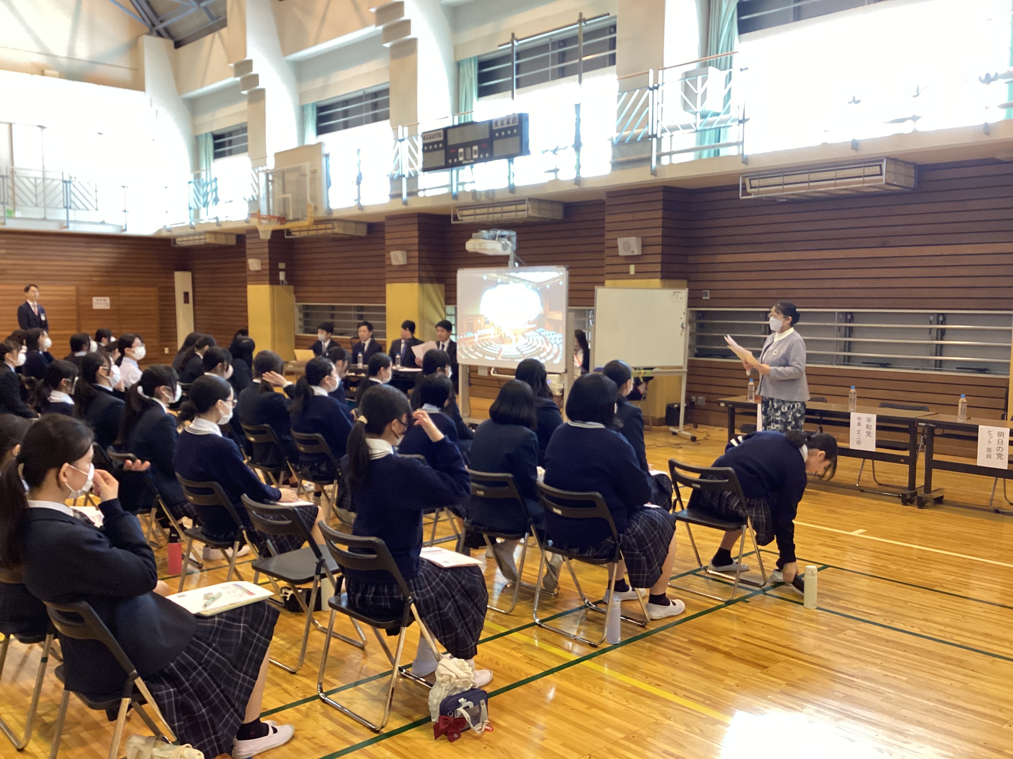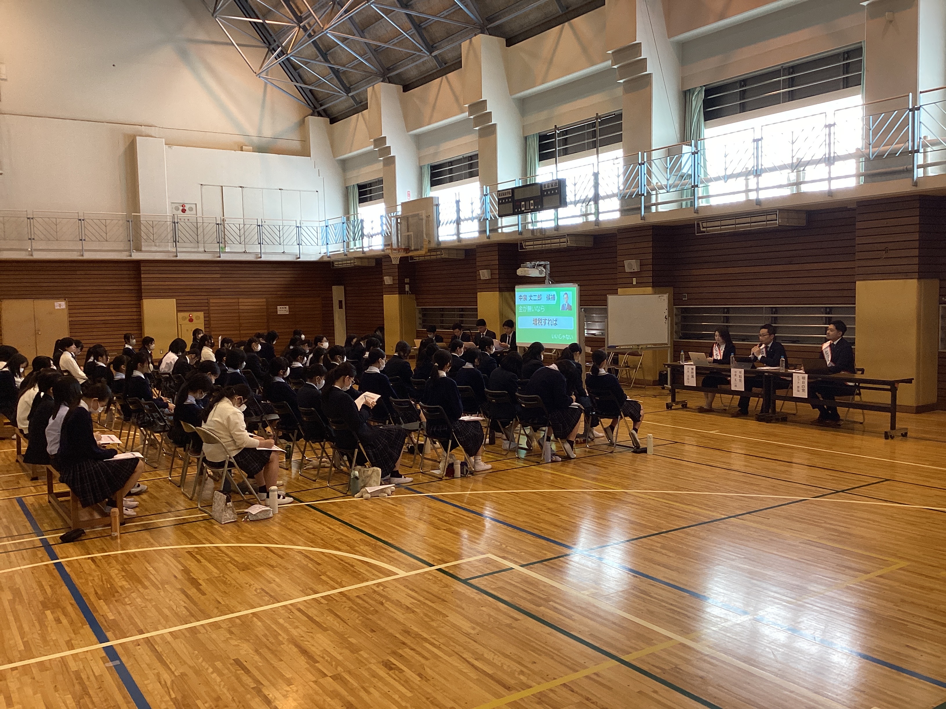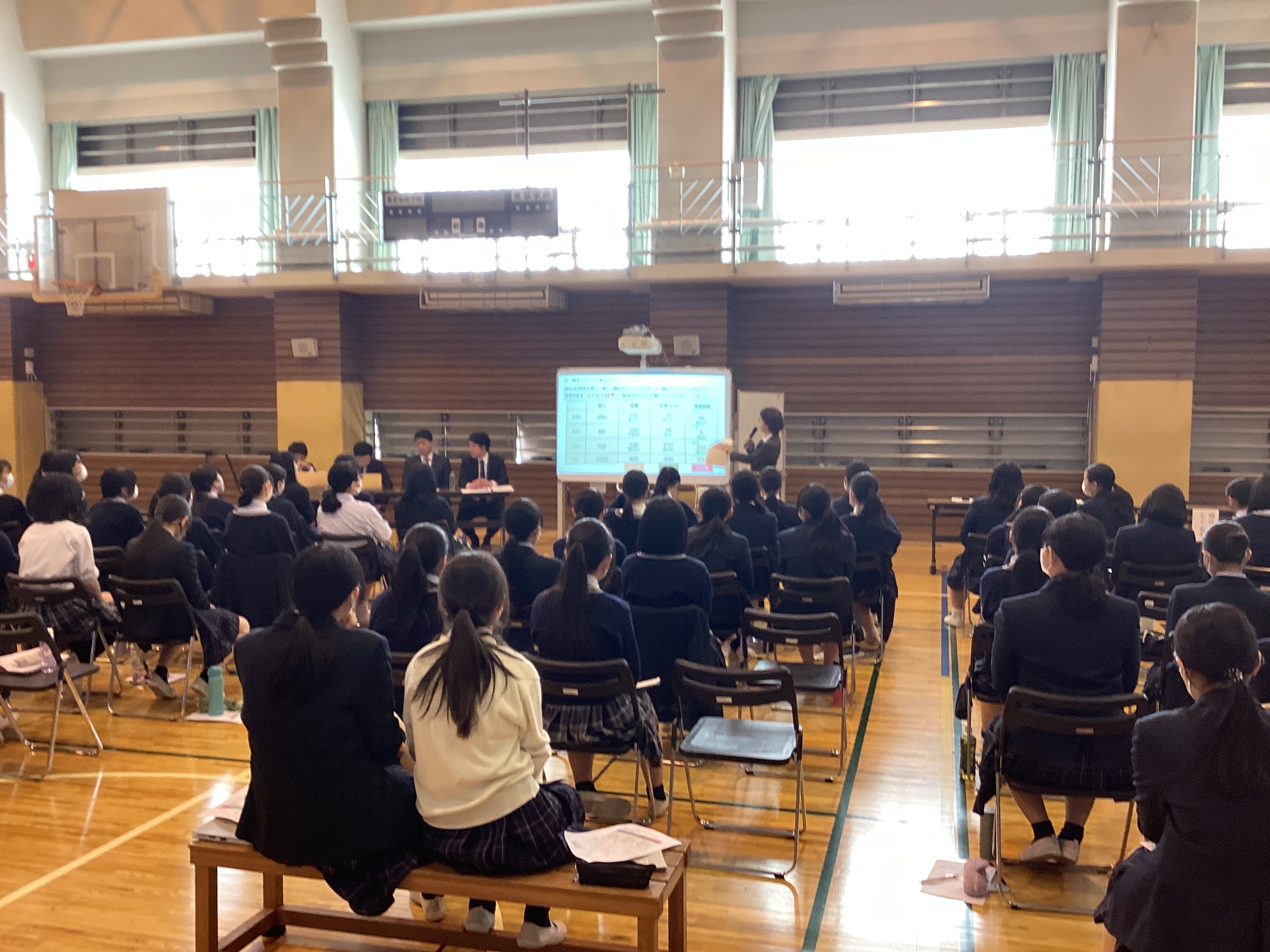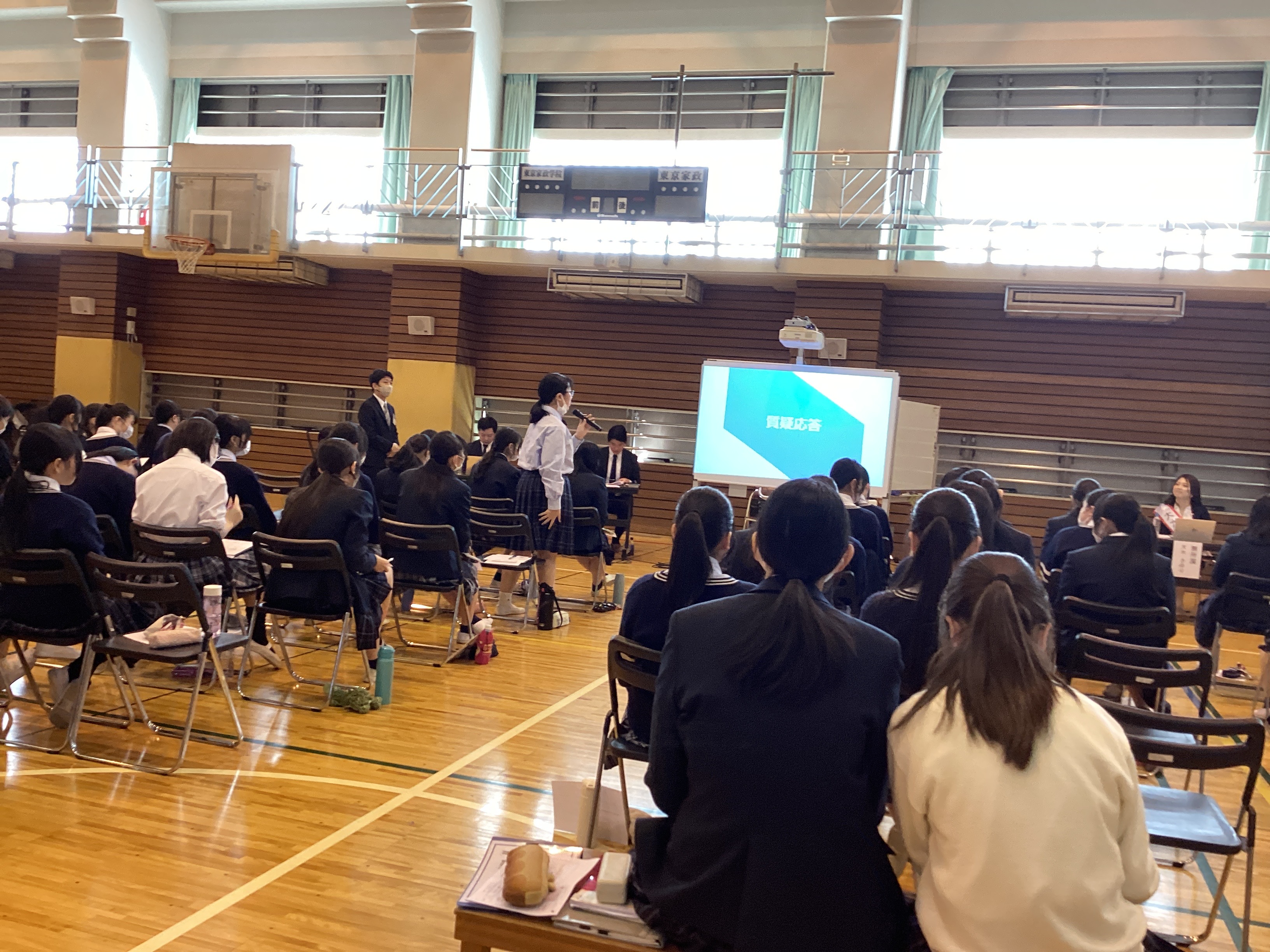 架空の都市の区長選挙の立候補者を3名立てて、実際に演説や討論会が開かれました。また立候補者に生徒が質問をして、グループで意見を交わしてから、その上で投票を行いました。その他、選挙に関するクイズや税金についてのお話も伺いました。18歳からの選挙に向けて有意義な学習でした。