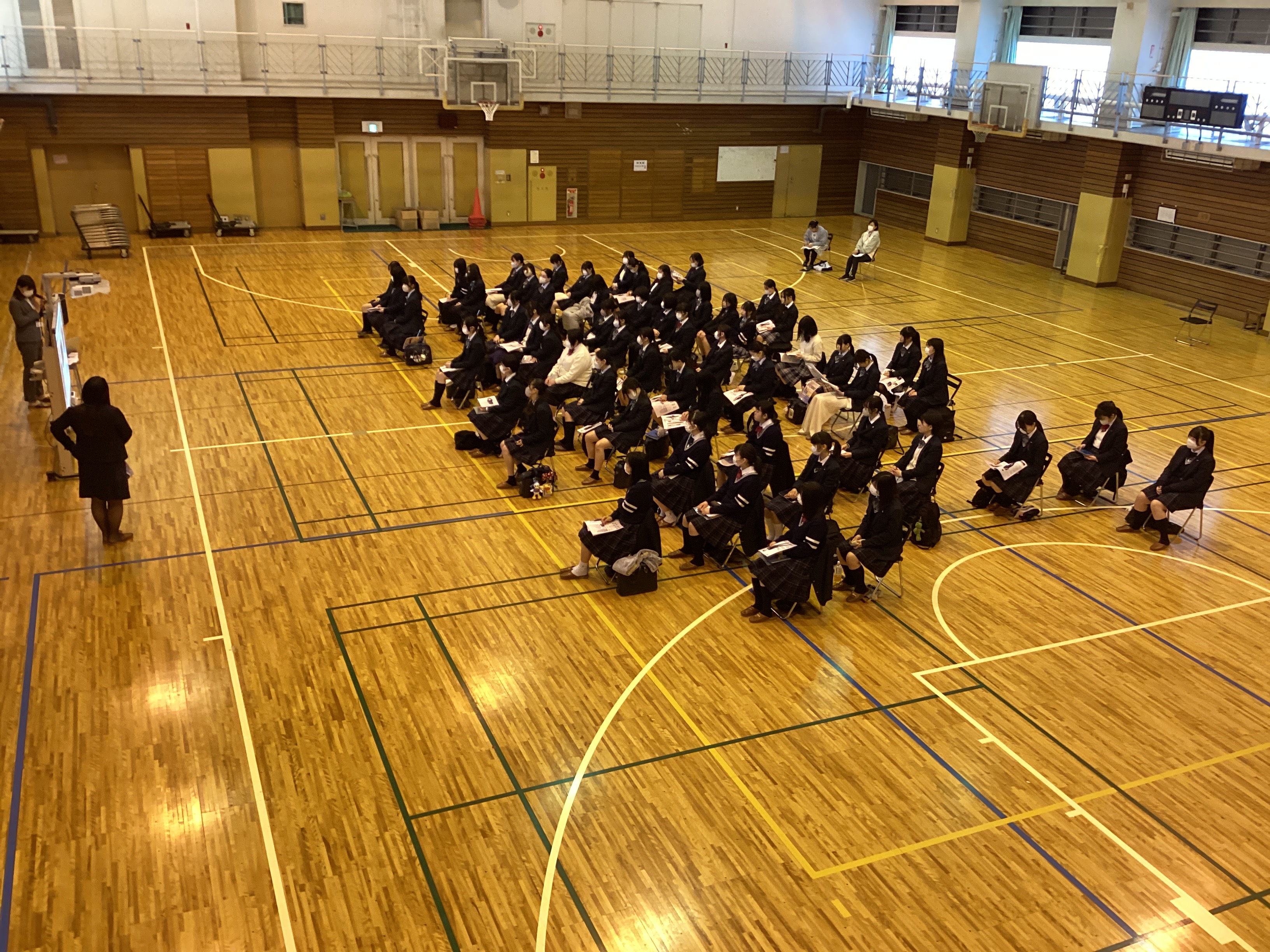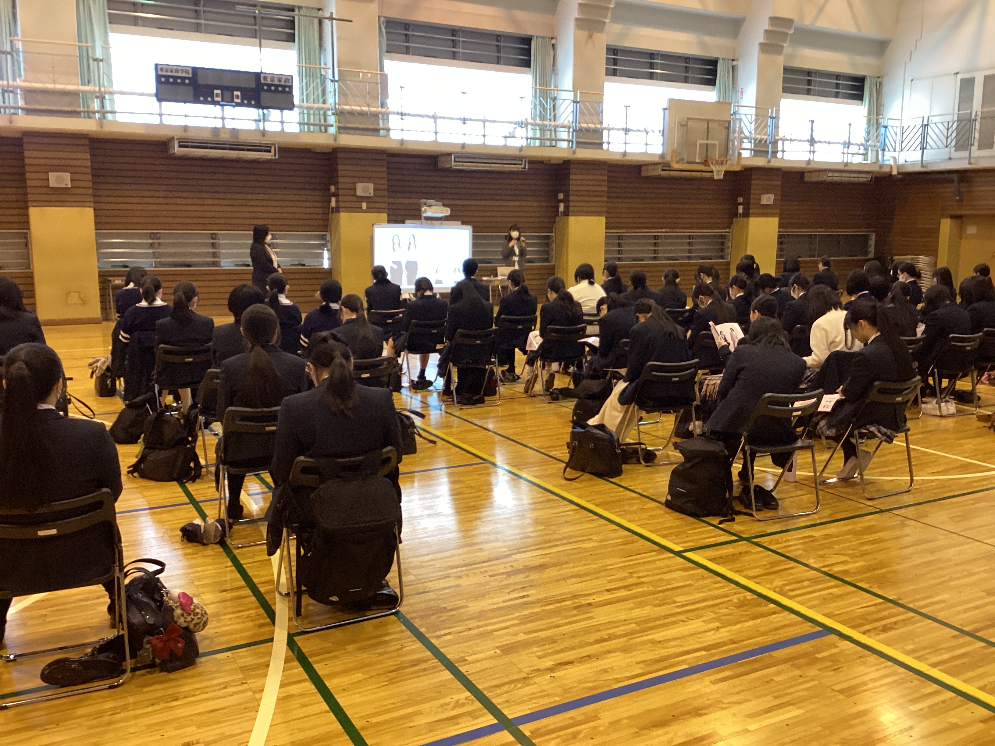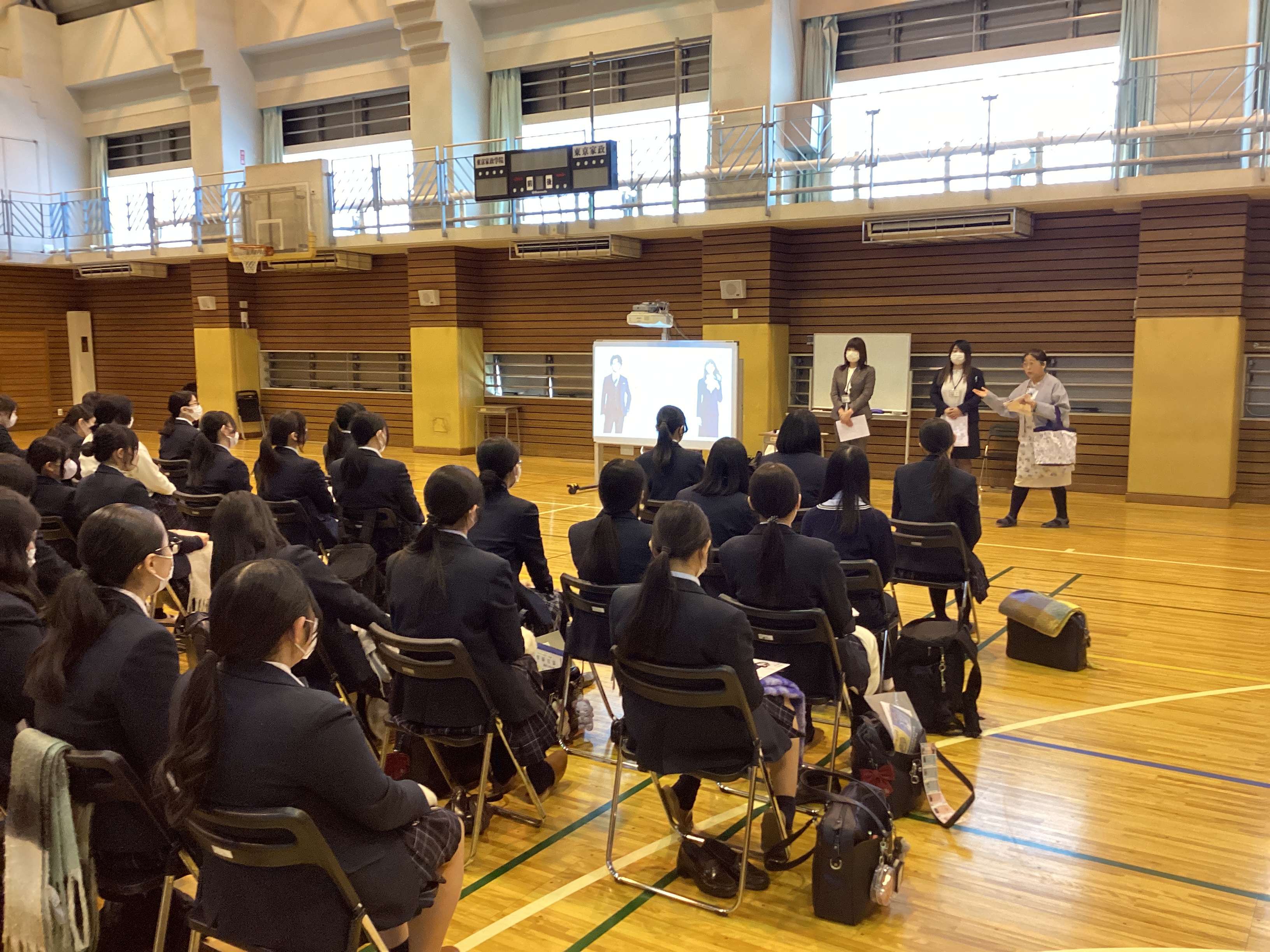 入学式で必要なスタンダードのスーツや、冠婚葬祭でのフォーマルな装いを意識したスーツの着こなし方セミナーを紳士服のコナカさんの方にお越し頂き、お話を聴かせて頂きました。パンツスタイルとスカートスタイルそれぞれのポイントを紹介すると、生徒たちは姿勢や丈感の違いに気づき、自分の服装を熱心に確認していました。ネクタイやリボン、靴との組み合わせにも関心が高く、場にふさわしい服装の大切さを学びながら、進学や将来を具体的に思い描く様子が見られました。